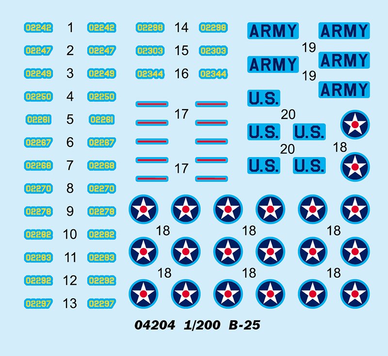 Nicht zusammengebauter und unbemalter Modellbausatz. Die zur Fertigstellung benötigten Farben sowie der Klebstoff für den Bausatz B-25 sind nicht im Lieferumfang enthalten.