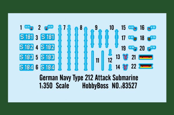 Nicht zusammengebauter und unbemalter Modellbausatz. Die zur Fertigstellung benötigten Farben sowie der Klebstoff für den Bausatz German Navy Type 212 Attack Submarine sind nicht im Lieferumfang enthalten.