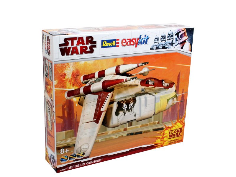 Nicht zusammengebauter und unbemalter Modellbausatz. Die zur Fertigstellung benötigten Farben sowie der Klebstoff für den Bausatz Republic Gunship (Clone Wars) sind nicht im Lieferumfang enthalten.