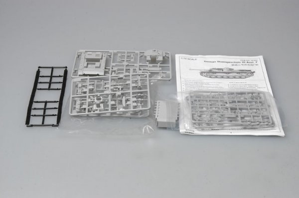 Nicht zusammengebauter und unbemalter Modellbausatz. Die zur Fertigstellung benötigten Farben sowie der Klebstoff für den Bausatz Sturmgeschütz III F sind nicht im Lieferumfang enthalten.